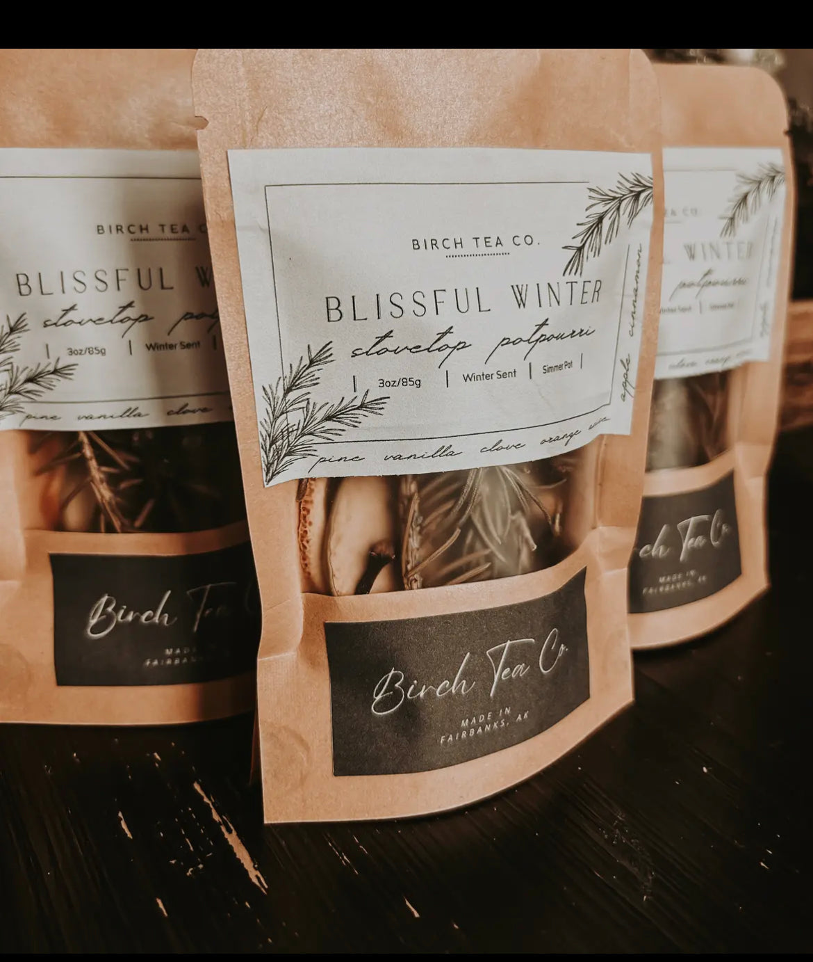 Blissful Winter Potpourri Stovetop Simmer Pot blend wraps you in a warm hug with the Sweet aroma of Pine, Citrus, Spice & Vanilla! The perfect blend of fresh and warm scents! Let the warmth of Vanilla, Clove, Cinnamon, & Anise Star wash over you. While the bursts of fresh Pine, Rosemary, & Orange cleanse the air!